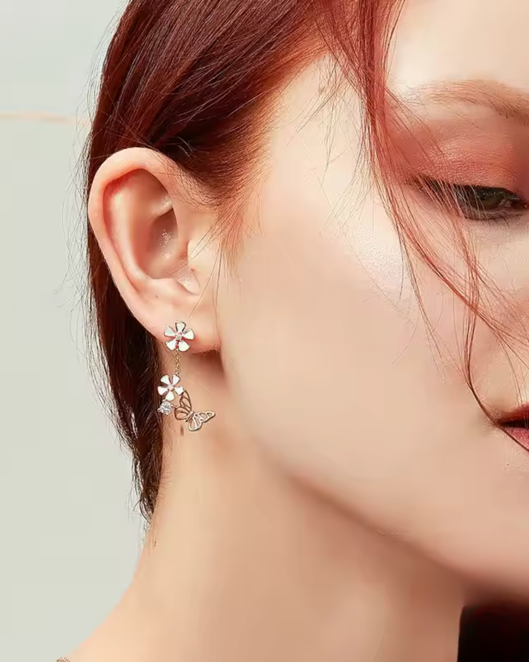 Cada pieza combina flores esmaltadas con mariposas finamente talladas, realzadas con circonias cúbicas que aportan destellos de luz en cada movimiento. Su diseño asimétrico los convierte en un accesorio moderno y versátil, ideal para quienes buscan destacar con un detalle único y femenino.