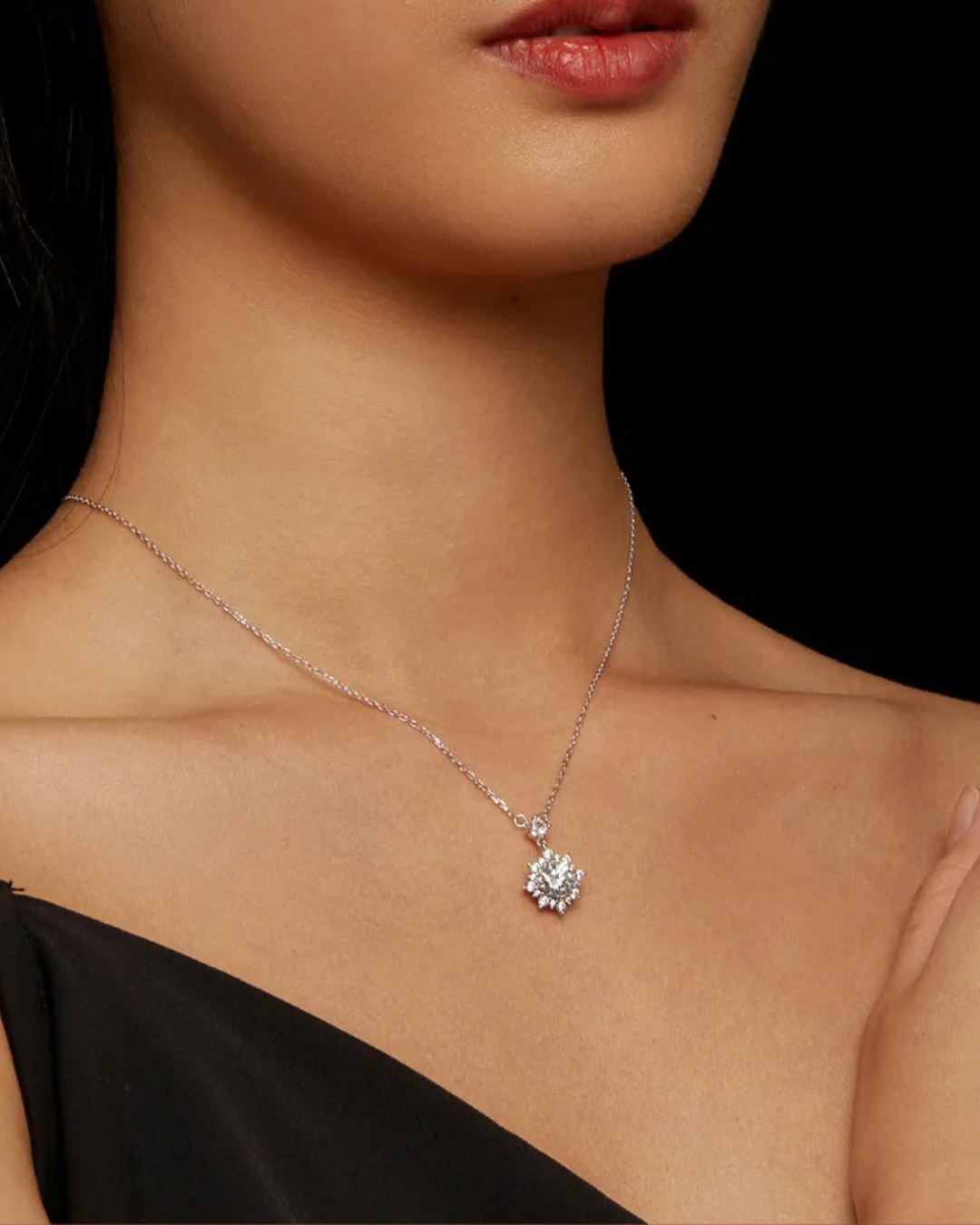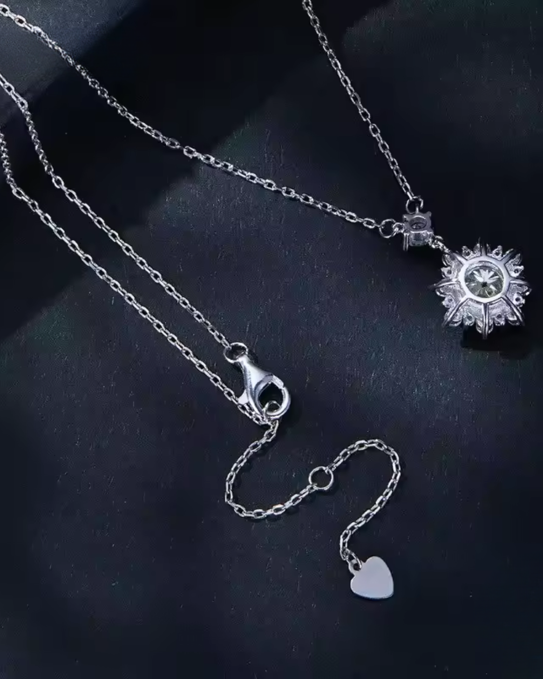 Dazzle with the magic of eternal sparkle. This exquisite necklace, inspired by the purity of a snowflake, combines the elegance of 925 sterling silver plated in platinum with the unmatched brilliance of a 1.0ct central moissanite, surrounded by a delicate pavé setting of cubic zirconia that enhances every glimmer.